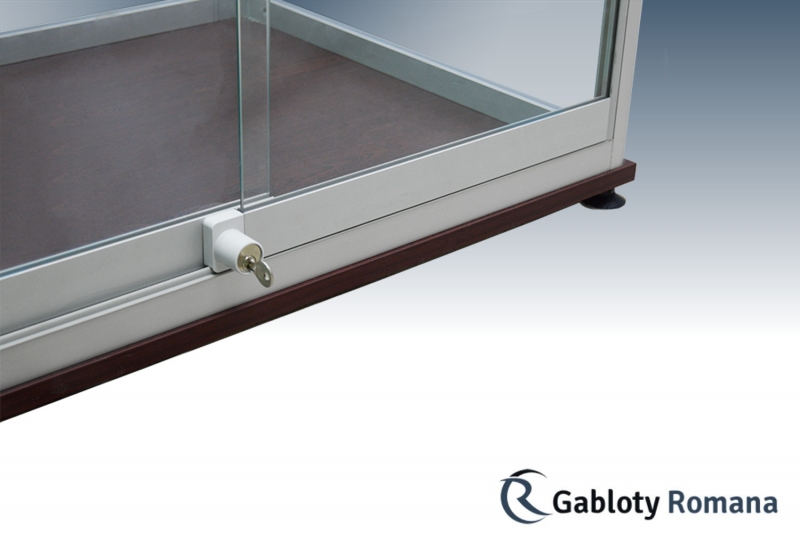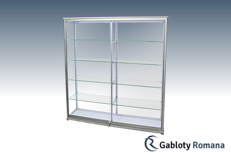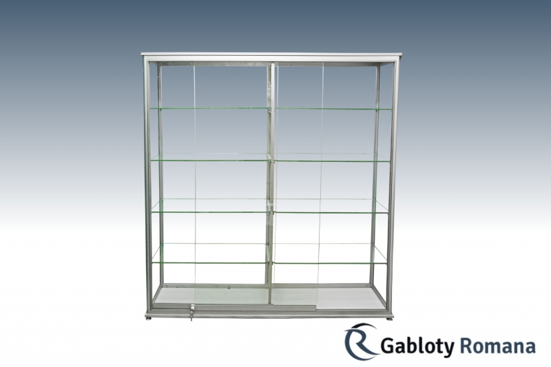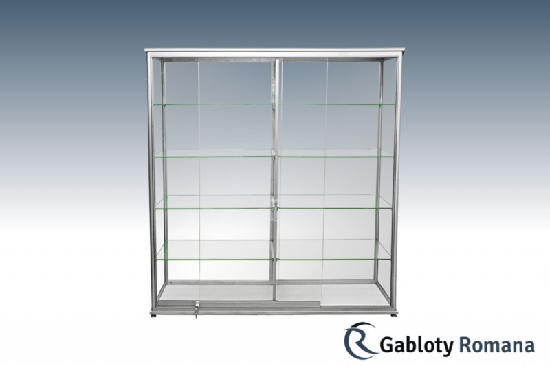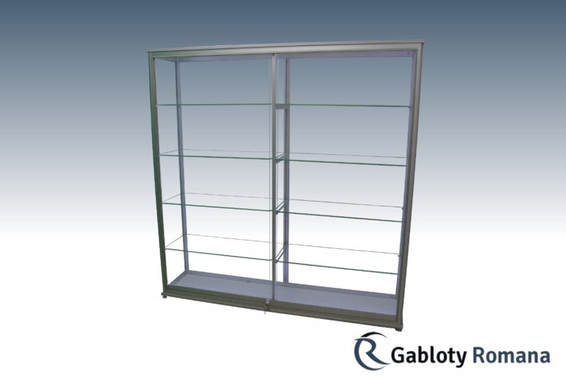 Wysokiej klasy witryna przeznacona do ekspozycji towarów. Szkielet witryny jest wykonany z profili aluminiowych anodowanych na kolor srebrny mat (w standardzie) połączonych z elegancką płytą meblową tworzącą dno i wierzch witryny. Sciany boczne i tylna ze szkła o grubości 4 mm. Zawartość witryny dostępna dzięki systemowi szyb przesuwnych, które w najmniejszym stopniu nie ograniczają widoczności do wnętrza gabloty. Półki szklane o regulowanej wysokości.
