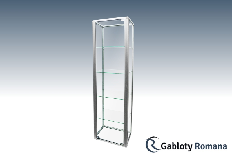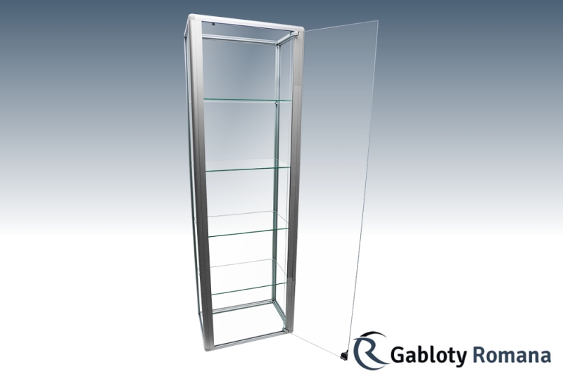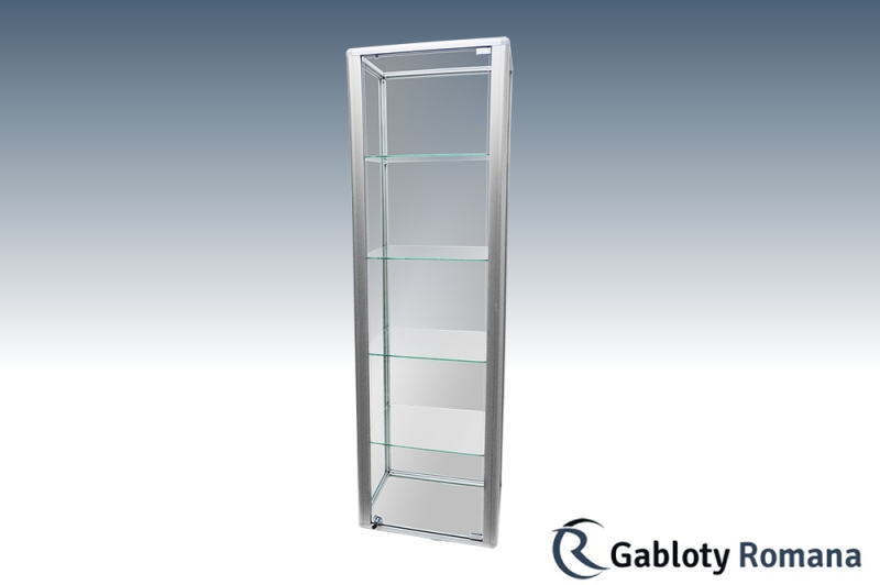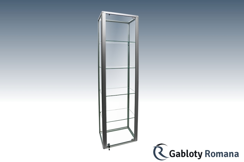 Wysokiej klasy witryna przeznacona do ekspozycji towarów. Szkielet witryny jest wykonany z profili aluminiowych anodowanych na kolor srebrny mat (w standardzie). Sciany boczne i tylna ze szkła o grubości 4 mm. Drzwi otwierane na boki zabezpieczone zamkiem patentowym. Drzwi pozbawione ram zapewniają bardzo dobry wgląd do wnętrza gabloty. Półki szklane o regulowanej wysokości.