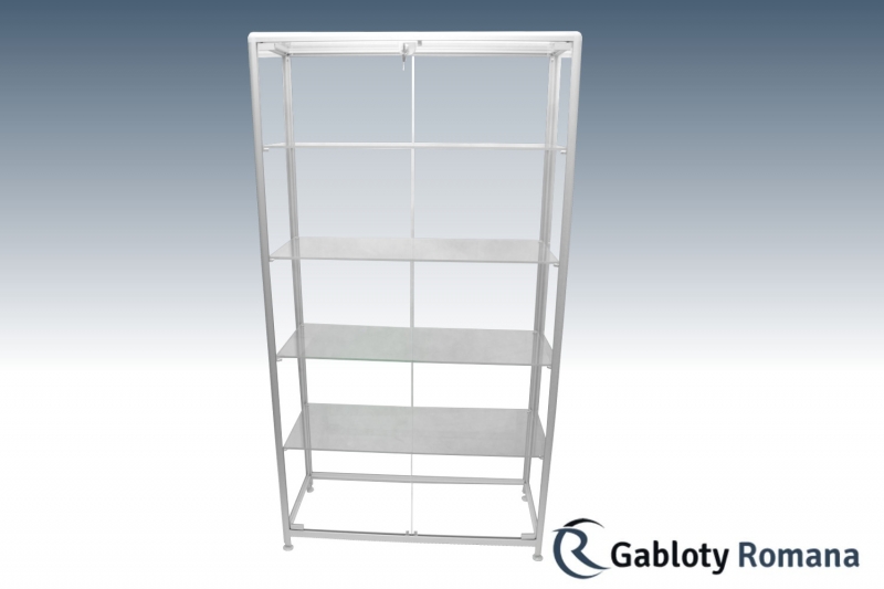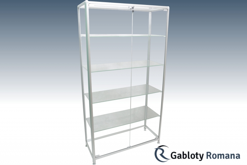 Wysokiej klasy witryna przeznaczona do ekspozycji towarów. Szkielet witryny jest wykonany z profili aluminiowych anodowanych na kolor srebrny lub złoty mat (w standardzie). Profile tworzące obramowanie witryny przedłużone w nóżki zapewniające estetyczne i pewne oparcie konstrukcji. Sciany boczne i tylna ze szkła o grubości 4 mm. Drzwi otwierane na boki zabezpieczone zamkiem patentowym. Drzwi pozbawione ram zapewniają bardzo dobry wgląd do wnętrza gabloty. Półki szklane o regulowanej wysokości.