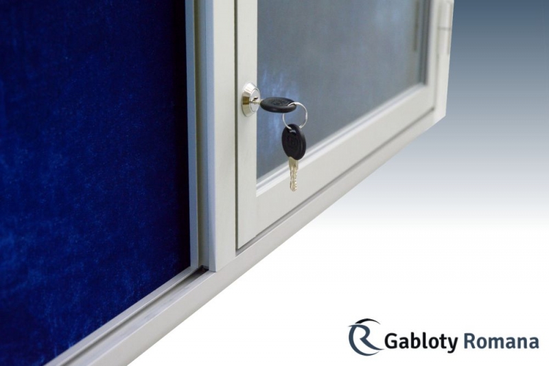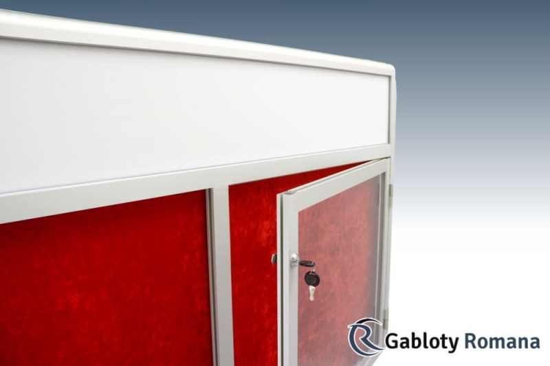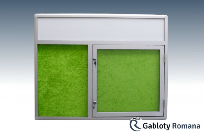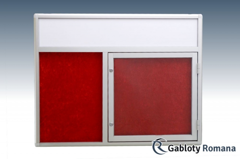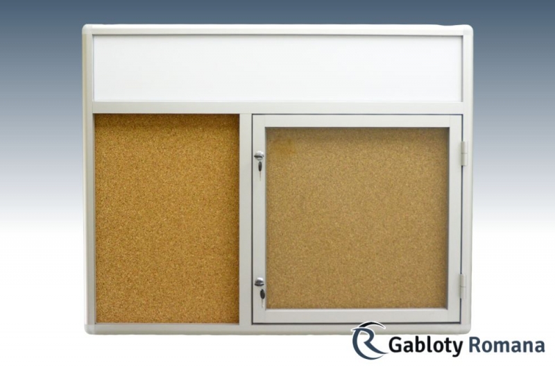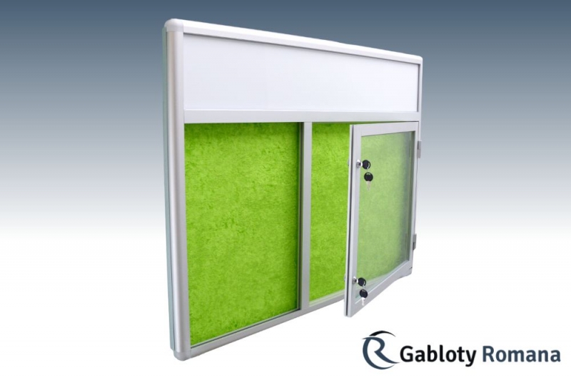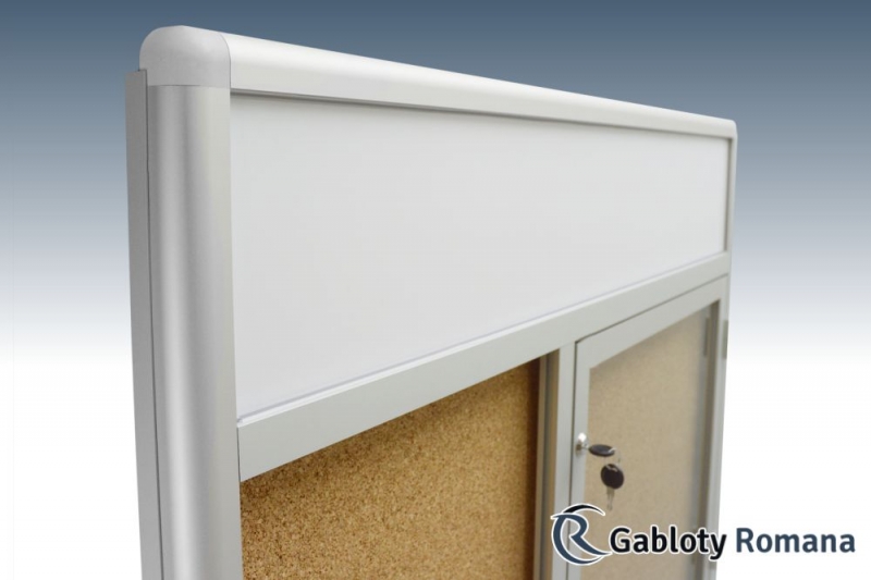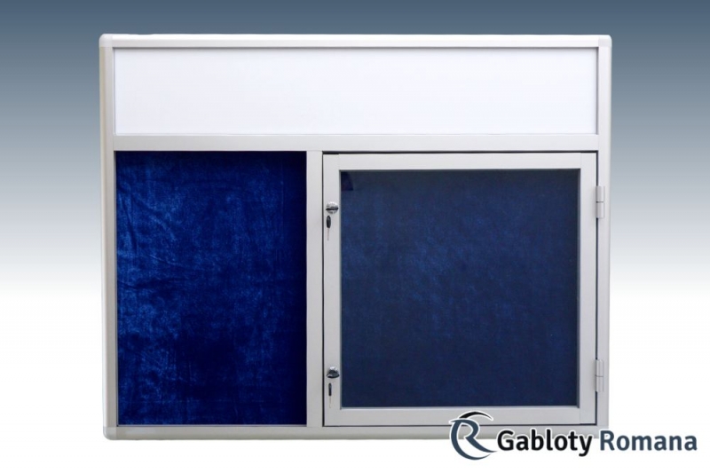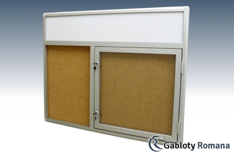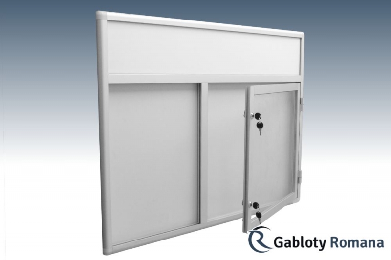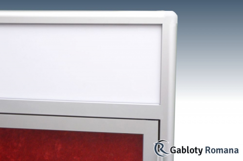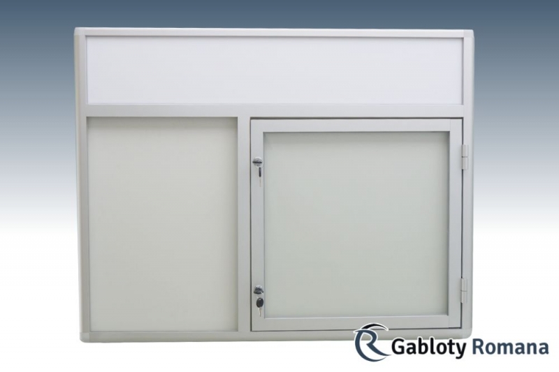 Gablota ogłoszeniowa, jednoskrzydłowa o głębokości 30mm. Górę gabloty stanowi płyta plex mleczna o wysokości 17cm opatrzonym logo bądź napisem w/g specyfikacji Klienta.