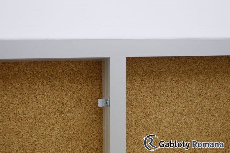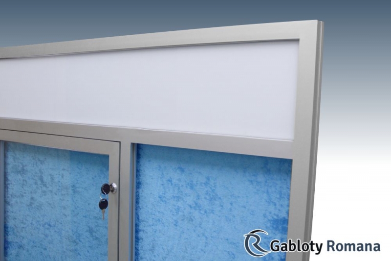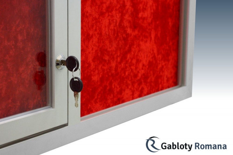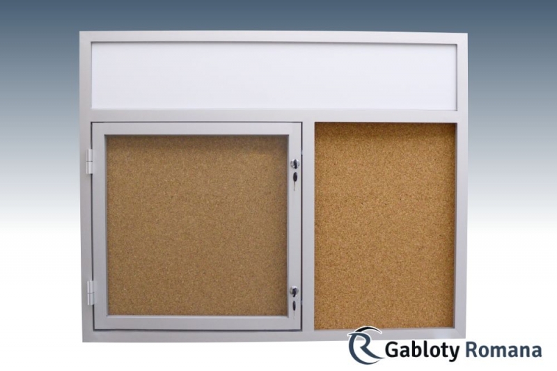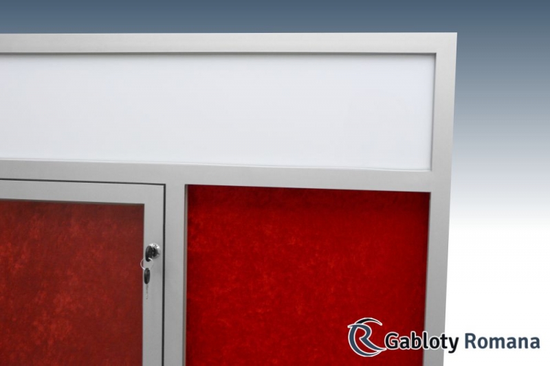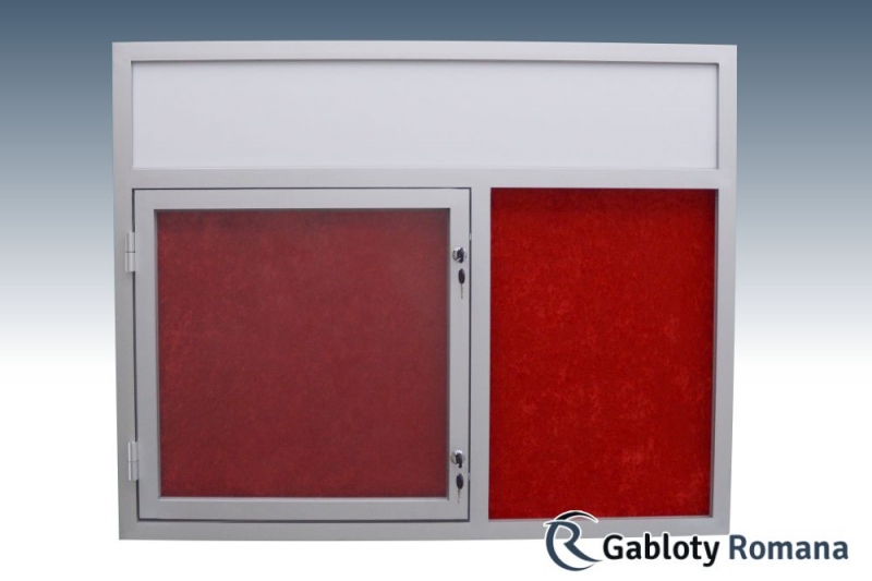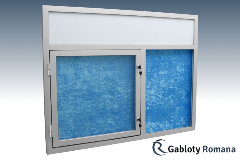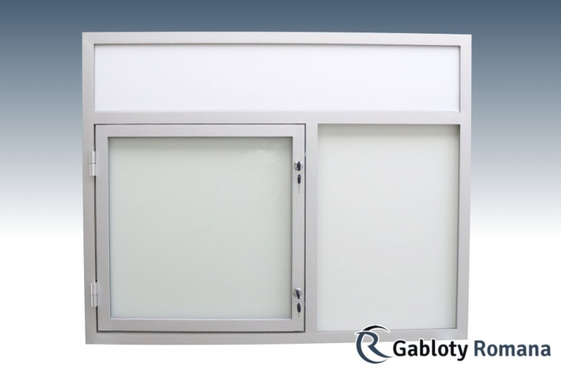 Gablota ogłoszeniowa, jednoskrzydłowa o grubości 32mm ma profil kwadratowy, ściany pod kątem 45 stopni zamiast plastikowych głowic montażowych. Górę gabloty stanowi płyta plex mleczna o wysokości 17cm opatrzonym logo bądź napisem w/g specyfikacji Klienta. Gablota częściowo otwierana ma 1/3 swojej powierzchni otwartą na stałe z płytą magnetyczną malowaną proszkowo na biało, natomiast pozostała część gabloty (2/3 chroniona jest szybą zwykłą o grubości 4mm, gdzie wnętrze może stanowić płyta magnetyczna. Zamykaną część zabezpieczamy zamkiem patentowym. Profile aluminiowe anodowane w standardzie na kolor srebrny. Nasze gabloty ogłoszeniowe produkowane są wyłącznie z części polskich, duńskich i niemieckich z certyfikatami jakości.