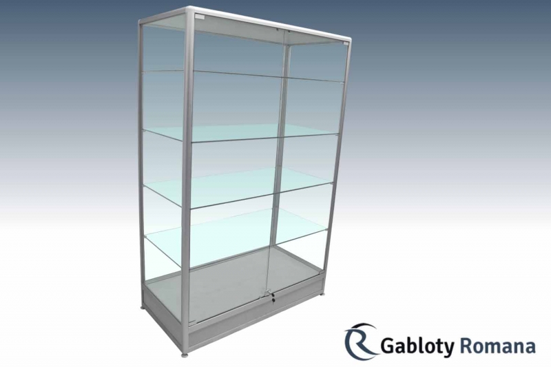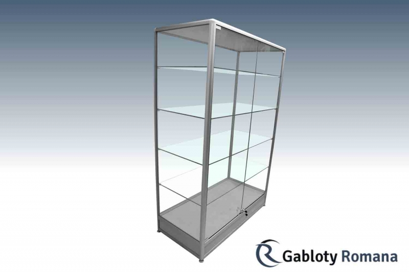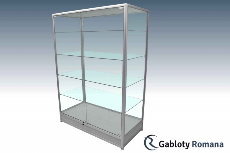 Wysokiej klasy witryna przeznaczona do ekspozycji towarów. Szkielet witryny jest wykonany z profili aluminiowych anodowanych na kolor srebrny mat (w standardzie) połączonych z elegancką płytą meblową tworzącą dno i wierzch witryny. Sciany boczne i tylna ze szkła o grubości 4 mm. Dwoje drzwi otwieranych na boki zabezpieczonych zamkiem patentowym. Drzwi pozbawione ram zapewniają bardzo dobry wgląd do wnętrza gabloty. Półki szklane o regulowanej wysokości.