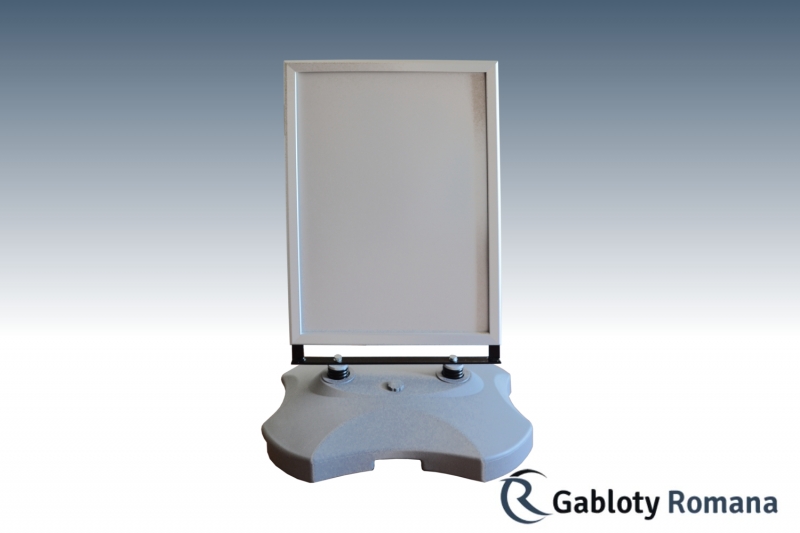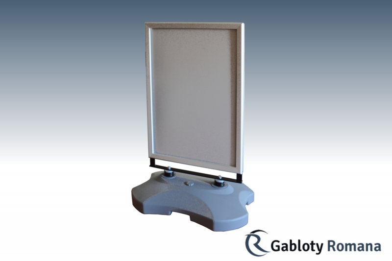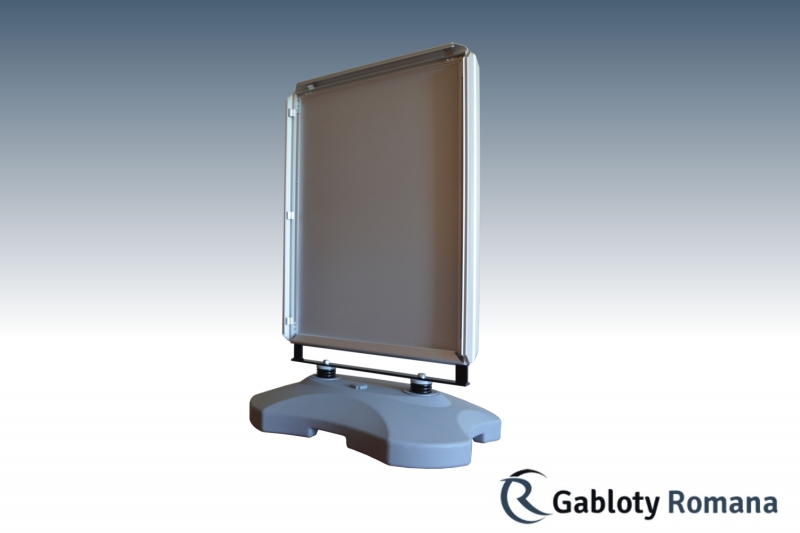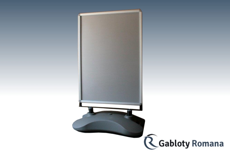 Nowoczesny stojak reklamowy przeznaczony na ekspozycję materiałów z dwóch stron. Stojak reklamowy waterbase wykonany jest z profili aluminiowych 3cm, które łączą się ze sobą bezpośrednio lub pod kątem prostym. Stojak reklamowy idealnie się nadaje do użytkowania wewnętrznego i zewnętrznego. Stojak może bieć wymiar dostosowany do życzenia klienta. Część ekspozycyjna jest wykonana z płyty PCW wyyposażonej w system owz. Materiały są wymieniane przy pomocy ram zatrzaskowych umieszczonych w profilach. Podstawa stojaka reklamowego wolnostojącego to pojemnik wyposażony w kółka ułatwiające przesuwanie. Plastikowy pojemnik może być dodatkowo wypełniopny wodą lub piaskiem. Takie wypełnienie zapewni stabilność. który można wypełnić wodą lub piaskiem, dzięki czemu stojak jest bardzo stabilny.