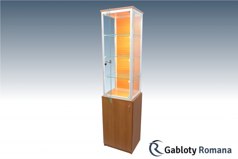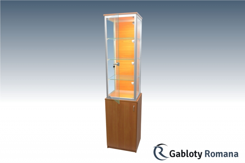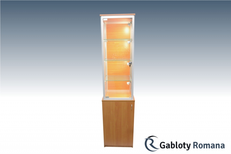 Najwyższej jakości produkt, którego podstawa wykonana jest z płyty meblowej, naromiast górna część wykonana jest z aluminium oraz szkła hartowanego. Szkielet witryny jest wykonany z profili aluminiowych anodowanych na kolor srebrny mat (w standardzie) połączonych z elegancką płytą meblową tworzącą dno i wierzch witryny. Witryna wsparta na szafce wykonanej z płyty meblowej, wyposażonej w szafkę otwieraną na bok. Sciany boczne i tylna ze szkła o grubości 4mm. Zawartość witryny dostępna dzięki parze drzwi szklanych. Półki szklane o regulowanej wysokości.