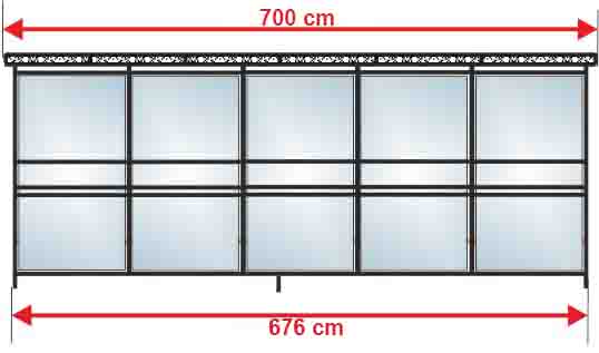 - Przeszklenie górnej części wiaty stanowi szyba hartowana 5 mm natomiast dolna pokryta jest blachą trapezową
